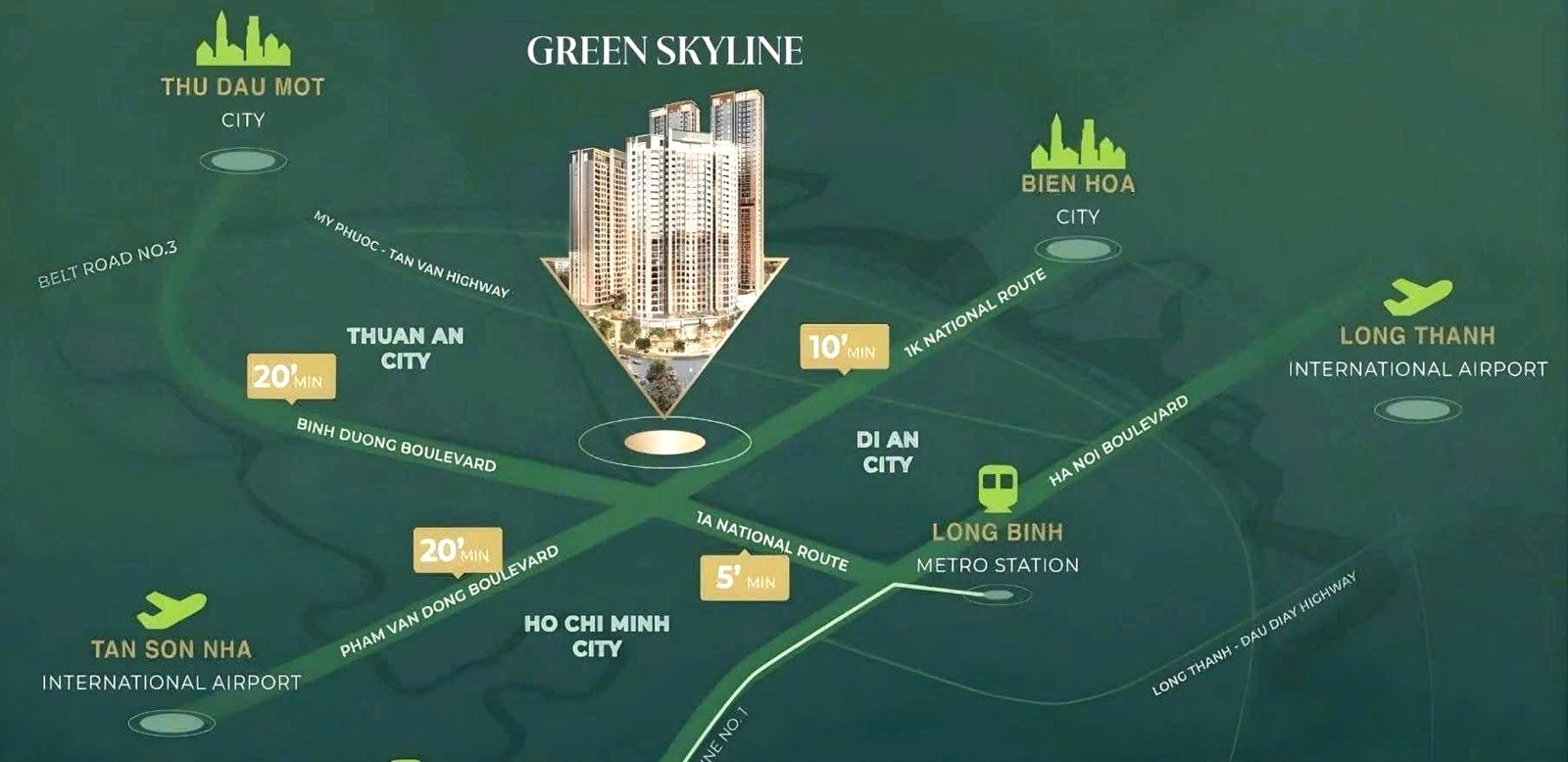 Vị trí căn hộ Green Skyline Dĩ An nằm tại trung tâm kết nối của thành phố Dĩ An, dễ dàng di chuyển đến: